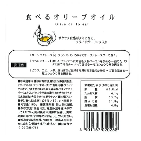 商品説明 | 名称:調味料 原材料名:食用なたね油(国内製造)、オリーブオイル、フライドガーリック、食塩、砂糖、フライドオニオン(小麦を含む)、にんにく、香辛料、チキンエキス、ポークエキス、パセリ、食用風味油(牛肉を含む)、たん白加水分解物(大豆を含む)、ゼラチン/調味料(アミノ酸等)、酸化防止剤(ビタミンE)、pH調整剤 |