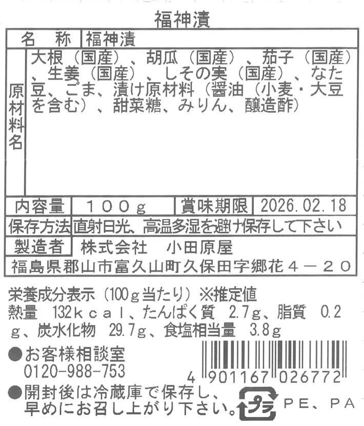 | 商品説明 | 名称:福神漬 原材料名:大根(国産)、胡瓜(国産)、茄子(国産)、生姜(国産)、しその実(国産)、なた豆、ごま、漬け原材料(甜菜糖、醬油[小麦・大豆を含む]、みりん、醸造酢) |