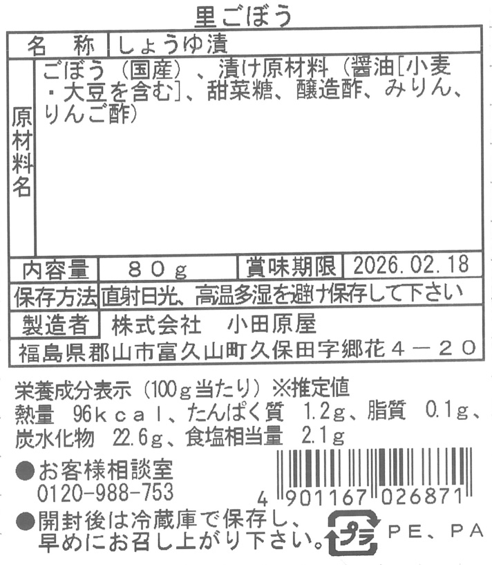 商品説明 | 名称:しょうゆ漬 原材料名:ごぼう(国産)、漬け原材料(醬油[小麦・大豆を含む]、甜菜糖、醸造酢、みりん、りんご酢) |