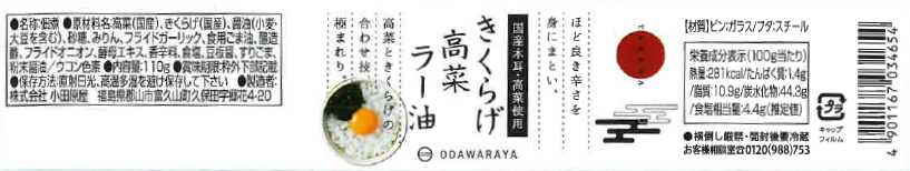 商品説明 | 名称:佃煮 原材料名:高菜(国産)、きくらげ(国産)、醬油(小麦・大豆を含む)、砂糖、みりん、フライドガーリック、食用ごま油、醸造酢、フライドオニオン、酵母エキス、香辛料、食塩、豆板醬、すりごま、粉末醬油/ウコン色素 |