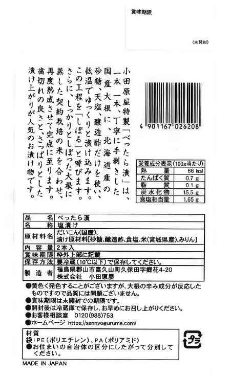商品説明 | 名称:塩漬け 原材料名:だいこん(国産)、漬け原材料[砂糖、醸造酢、食塩、米(宮城県産)、みりん] |