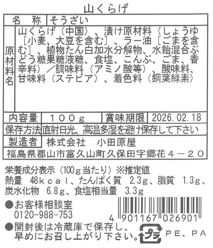 | 商品説明 | 名称:しょうゆ漬(刻み) 原材料名:山くらげ(中国)、漬け原材料(しょうゆ[小麦・大豆を含む]、ラー油、植物たん白加水分解物、水飴混合ぶどう糖果糖液糖、食塩、こんぶ、ごま、香辛料)/調味料(アミノ酸等)、酸味料、甘味料(ステビア)、着色料(銅葉緑素) |