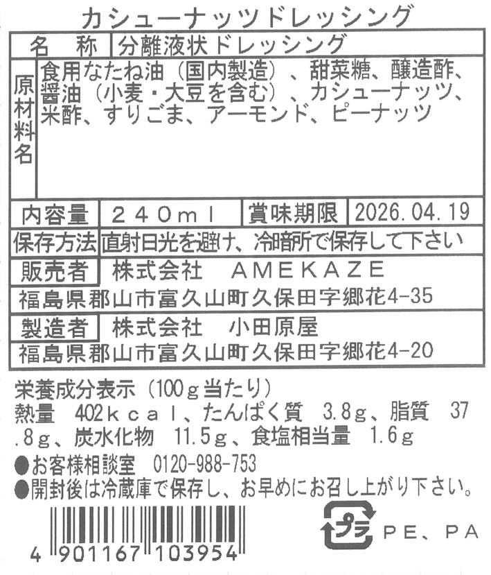 商品説明 | 名称:分離液状ドレッシング 原材料名:なたね油(国産製造)、甜菜糖、醸造酢、醤油(小麦・大豆を含む)、カシューナッツ、米酢、すりごま、アーモンド、ピーナッツ |