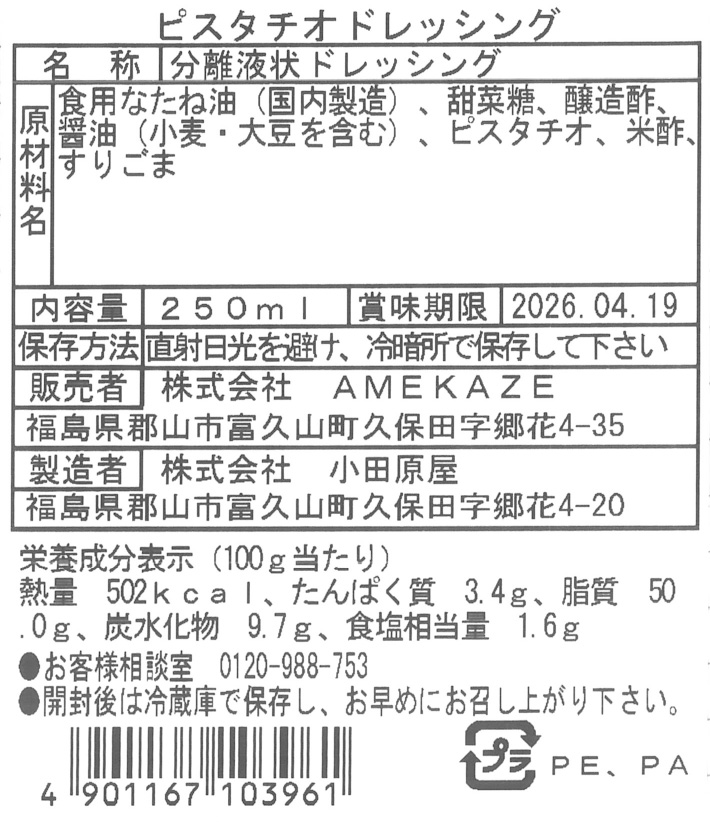 商品説明 | 名称:分離液状ドレッシング 原材料名:なたね油(国産製造)、甜菜糖、醸造酢、醤油(小麦・大豆を含む)、ピスタチオ、米酢、すりごま |