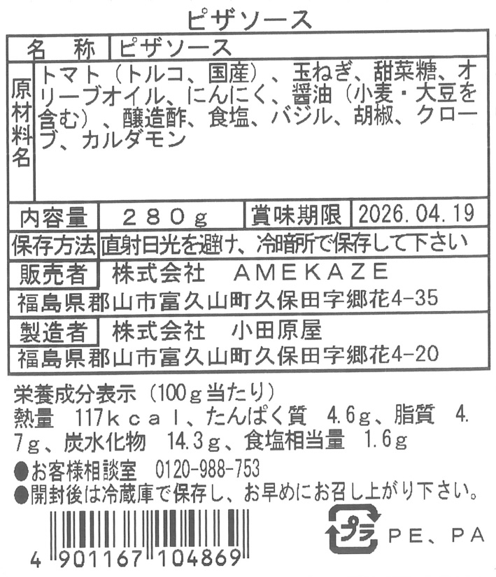 商品説明 | 名称:ピザソース 原材料名:トマト(トルコ、国産)、玉ねぎ、甜菜糖、オリーブオイル、にんにく、醤油(小麦・大豆を含む)、醸造酢、食塩、バジル、胡椒、クローブ、カルダモン |