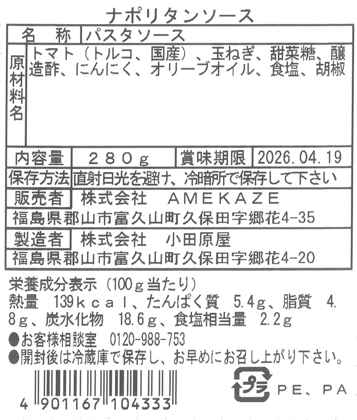 原材料名:トマト(トルコ、国産)、玉ねぎ、甜菜糖、オリーブオイル、醸造酢、にんにく、オリーブオイル、食塩、胡椒