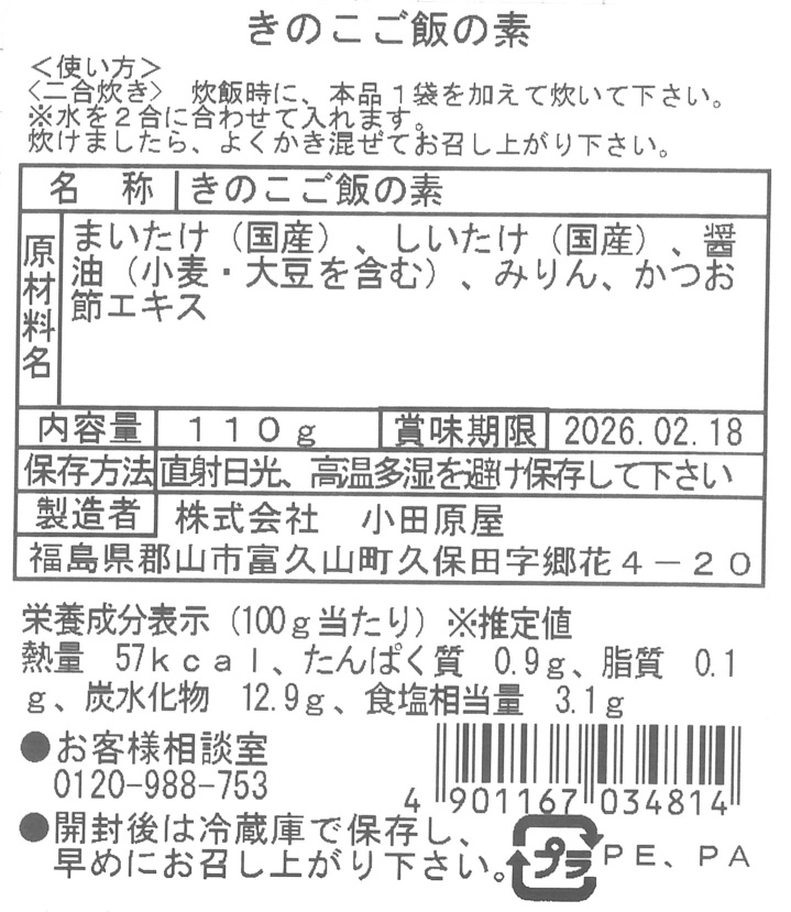 商品説明 | 名称:きのこご飯の素 原材料名:まいたけ(国産)、しいたけ(国産)、醤油(小麦・大豆を含む)、みりん、かつお節エキス |