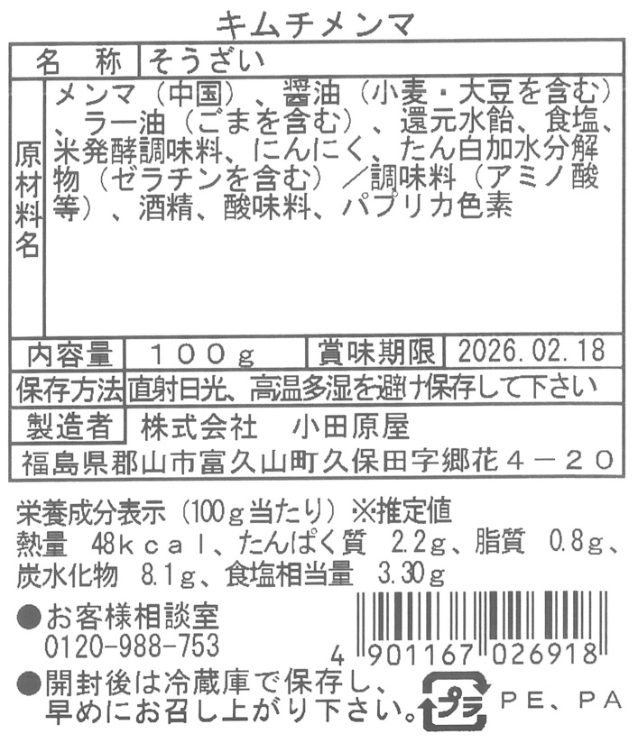商品説明 | 名称:そうざい 原材料名:メンマ(中国)、醬油(小麦・大豆を含む)、ラー油(ごまを含む)、還元水飴、食塩、米発酵調味料、にんにく、たん白加水分解物(ゼラチンを含む)/調味料(アミノ酸等)、酒精、酸味料、パプリカ色素 |