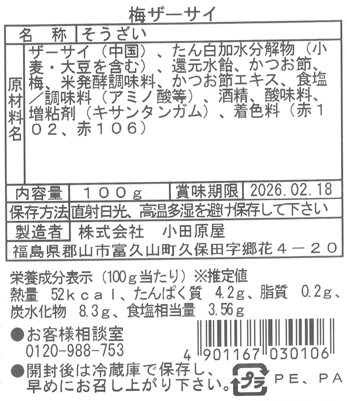 | 商品説明 | 名称:そうざい 原材料名:ザーサイ(中国)、たん白加水分解物(小麦・大豆を含む)、還元水飴、かつお節、梅、米発酵調味料、かつお節エキス、食塩/調味料(アミノ酸等)、酒精、酸味料、増粘剤(キサンタンガム)、着色料(赤102、赤106) |