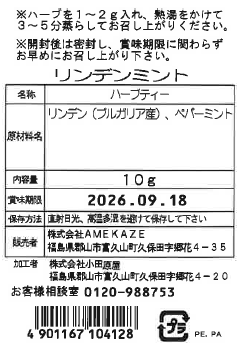 原材料名:リンデン(ブルガリア産)、ペパーミント