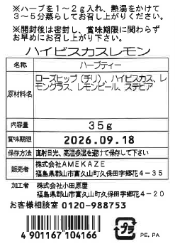原材料名:ローズヒップ(チリ)、ハイビスカス、レモングラス、レモンピール、ステビア