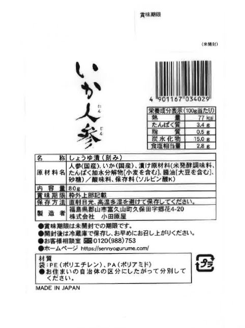 商品説明 | 名称:しょうゆ漬(刻み) 原材料名:人参(国産)、いか(国産)、漬け原材料(米発酵調味料、たんぱく加水分解物[小麦を含む]、醬油[大豆を含む]、砂糖)/調味料、保存料(ソルビン酸K) |