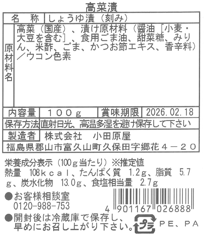 商品説明 | 名称:しょうゆ漬(刻み) 原材料名:高菜(国産)、漬け原材料(醤油[小麦・大豆を含む]、食用ごま油、甜菜糖、みりん、米酢、ごま、かつお節エキス、香辛料)/ウコン色素 |
