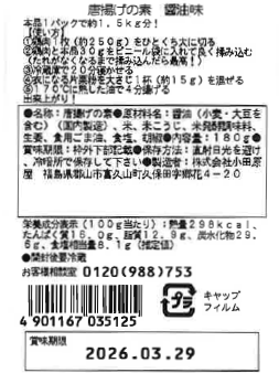 商品説明 | 名称:唐揚げの素 原材料名:醤油(小麦・大豆を含む)(国内製造)、甘酒(米、米こうじ、食塩)、米発酵調味料、生姜、食用ごま油、食塩、胡椒 |