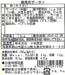 商品説明 | 名称:そうざい 原材料名:ザーサイ(中国)、漬け原材料(しょうゆ[小麦、大豆を含む]、還元水飴、たん白加水分解物[ゼラチンを含む]、ラー油[ごまを含む]、米発酵調味料、食塩、にんにく、香辛料)/調味料(アミノ酸等)、酸味料、パプリカ色素 |