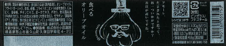 商品説明 | 名称:調味料 原材料名:食用なたね油(国産製造)、オリーブオイル、フライドガーリック、食塩、砂糖、フライドオニオン(小麦を含む)、にんにく、香辛料、チキンエキス、ポークエキス、パセリ、食用風味油(牛肉を含む)、たん白加水分解物(大豆を含む)、ゼラチン/調味料(アミノ酸等)、酸化防止剤(ビタミンE)、pH調整剤 |