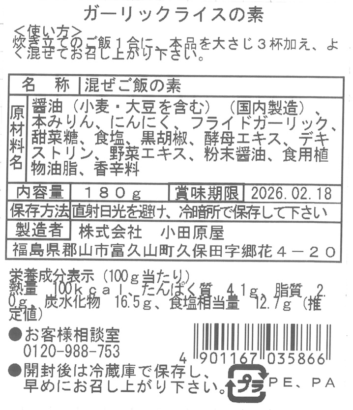 商品説明 | 名称:混ぜご飯の素 原材料名:醤油(小麦・大豆を含む)(国内製造)、本みりん、にんにく、フライドガーリック、甜菜糖、食塩、黒胡椒、酵母エキス、デキストリン、野菜エキス、粉末醤油、食用植物油脂、香辛料 |