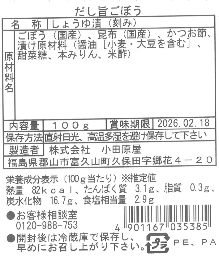 商品説明 | 名称:しょうゆ漬(刻み) 原材料名:ごぼう(国産)、昆布(国産)、かつお節、漬け原材料(醤油[小麦・大豆を含む]、甜菜糖、本みりん、米酢) |