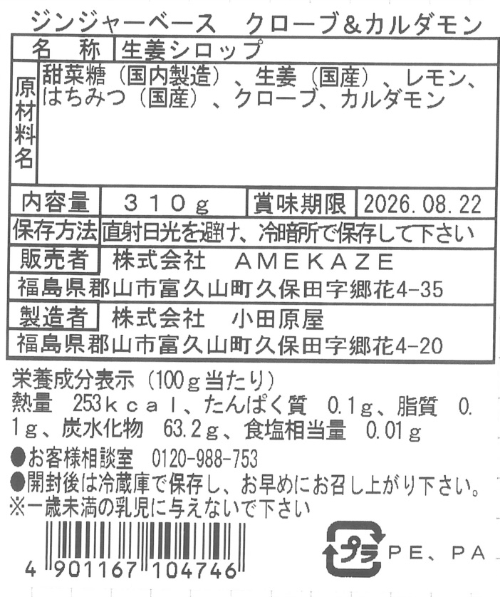 原材料名:甜菜糖(国内製造)、生姜(国産)、レモン、はちみつ(国産)、クローブ、カルダモン