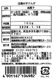 商品説明 | 名称:油菓子 原材料名:さつま芋(国産)、砂糖、植物油脂、海洋深層水、オリゴ糖 |