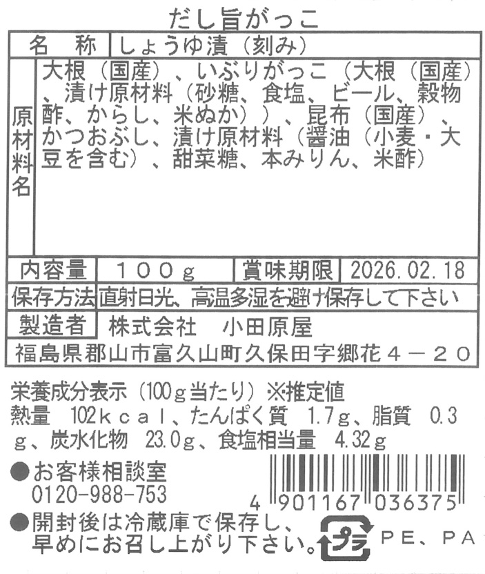 商品説明 | 名称:しょうゆ漬(刻み) 原材料名:大根(国産)、いぶりがっこ(大根(国産)漬け原材料(砂糖、食塩、ビール、穀物酢、からし、米ぬか))、昆布(国産)、かつおぶし、漬け原材料(醤油(小麦・大豆を含む)、甜菜糖、本みりん、米酢) |