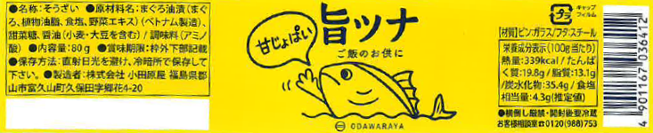 商品説明 | 名称:そうざい 原材料名:まぐろ油漬(まぐろ、植物油脂、食塩、野菜エキス)(ベトナム製造)、甜菜糖、醤油(小麦・大豆を含む)/調味料(アミノ酸) |