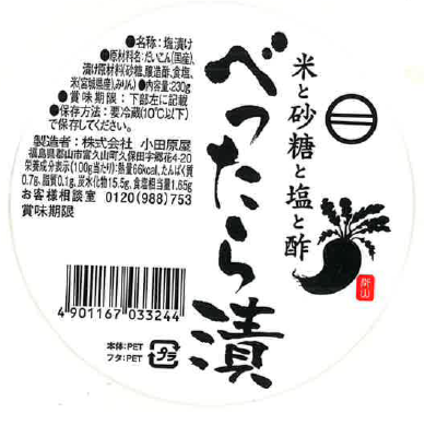 原材料名:だいこん(国産)、漬け原材料(砂糖、醸造酢、食塩、米(宮城県産)、みりん)