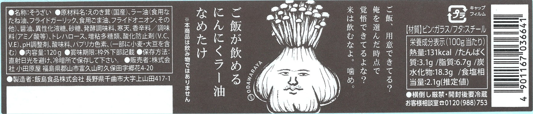 | 商品説明 | 名称:そうざい 材料名:えのき茸(国産)、ラー油(食用なたね油、フライドガーリック、食用ごま油、フライドオニオン、その他)、醤油、異性化液糖、砂糖、発酵調味料、寒天、香辛料/調味料(アミノ酸等)、トレハロース、増粘多糖類、酸化防止剤(V.C、V.E)、pH調整剤、酸味料、パプリカ色素、(一部に小麦・大豆を含む) |