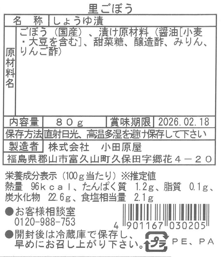 商品説明 | 名称:しょうゆ漬 原材料名:ごぼう(国産)、漬け原材料(醬油[小麦・大豆を含む]、甜菜糖、醸造酢、みりん、りんご酢) |