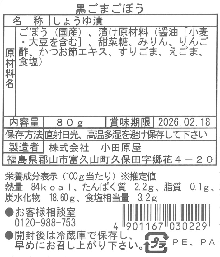 商品説明 | 名称:しょうゆ漬 原材料名:ごぼう(国産)、漬け原材料(醬油[小麦・大豆を含む]、甜菜糖、みりん、りんご酢、かつお節エキス、すりごま、えごま、食塩) |