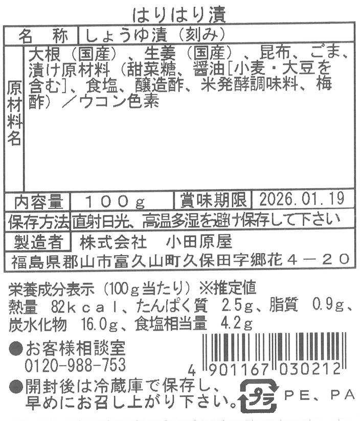 | 商品説明 | 名称:しょうゆ漬(刻み) 原材料名:大根(国産)、生姜(国産)、昆布、ごま、漬け原材料(甜菜糖、、醬油[小麦・大豆を含む]、食塩、醸造酢、米発酵調味料、梅酢)/ウコン色素 |