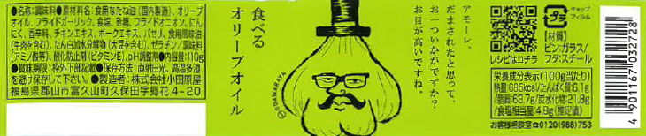 商品説明 | 名称:調味料 原材料名:食用なたね油(国産製造)、オリーブオイル、フライドガーリック、食塩、砂糖、フライドオニオン(小麦を含む)、にんにく、香辛料、チキンエキス、ポークエキス、パセリ、食用風味油(牛肉を含む)、たん白加水分解物(大豆を含む)、ゼラチン/調味料(アミノ酸等)、酸化防止剤(ビタミンE)、pH調整剤 |