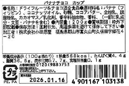 商品説明 | 名称:ドライフルーツ&チョコ混合食品 原材料名:バナナ(フィリピン)、ココナッツオイル、砂糖、ココアバター、全粉乳、脱脂粉乳、カカオマス/乳化剤、香辛料抽出物、香料、(一部に乳成成分・大豆・バナナを含む) |